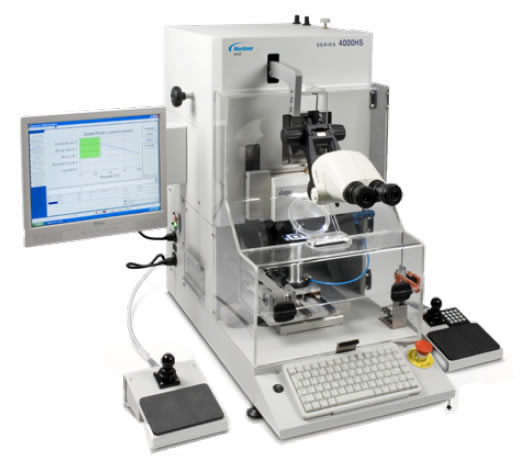 The Nordson DAGE 4000HS bondtester is based upon the industry standard Nordson DAGE 4000 multi-purpose bondtester platform. The 4000HS has significant differences to the mode of operation for both shear and pull modes with speeds up to 4m/sec for shear and 1.3m/s for pull. The 4000HS bondtester also offers advanced analysis options, specifically force versus displacement graphs and energy measurements in addition to the conventional peak force measurement. The Nordson DAGE 4000HS bondtester provides high speed bondtesting for the assessment of failure mode rather than measurement of failure force. Key Features: ? Up to 4M/Sec Shear with automatic software controlled “retraction distance”; ? Up to 1.3M/Sec Cold Bump Pull. ? Up to 600MM/Sec Zone Shear up to 80KG (to be confirmed); ? Ultra high band width force measurement transducers (patent pending); ? Dage patented frictionless air bearing ball shear technology; ? CBP Testing using industry standard patented jaw technology; ? Built in automatic safety guards using interlocks (CE and UL compliant).Complete with home position load/unload; ? Test results selectable in Force/Grams or Energy/Joules; ? Optional F vs D curves, test velocity, test distance or test time reports; ? Single adjust optics mounting, keeping the region of interest in focus when changing the operator eyeline; ? Servo drive power control while under load (motor/encoder positional control withclose loop calculation); ? Up to 4M/Sec Shear with automatic software controlled “retraction distance”; ? Up to 1.3M/Sec Cold Bump Pull; ? Up to 600MM/Sec Zone Shear up to 80KG (to be confirmed); ? Ultra high band width force measurement transducers (patent pending); ? Dage patented frictionless air bearing ball shear technology; ? CBP Testing using industry standard patented jaw technology; ? Built in automatic safety guards using interlocks (CE and UL compliant).Complete with home position load/unload; ? Test results selectable in Force/Grams or Energy/Joules; ? Optional F vs D curves, test velocity, test distance or test time reports; ? Single adjust optics mounting, keeping the region of interest in focus when changing the operator eyeline; ? Servo drive power control while under load (motor/encoder positional control withclose loop calculation). Specifications: Machine Footprint: D: 850mm W: 1100mm H: 670mm Weight: 100kg Power Supply: Switchable 100/110v , 220/240v AC 50/60 Hz International Certification: JEDEC; JEITA; European CE Regulations; Safety Directive… |